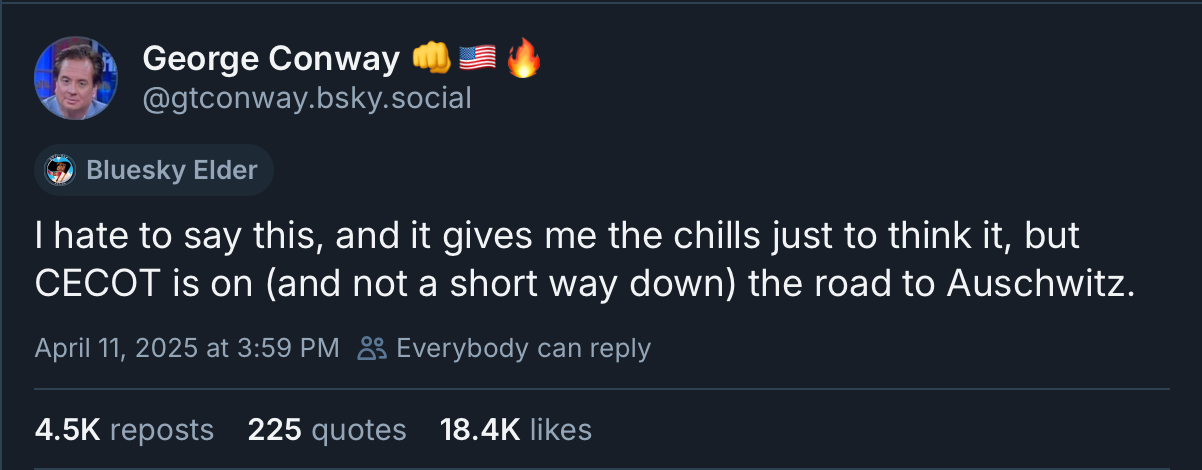The Trump administration snatching up people and sending them to an El Salvadoran prison (CECOT) without due process is unconscionable. The conditions there amount to torture. They're doing this to people present in the US legally and with no known criminal history anywhere. Most persons sent there are from Venezuela, and some unknown portion of them have never been to El Salvador. Homeland Security Secretary Kristi Noem says these people should stay there "for the rest of their lives." I don't think this is an unreasonable thing to say: