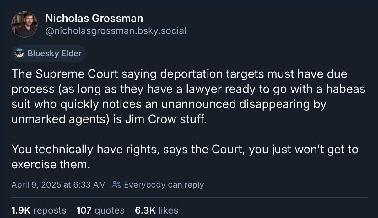 Separately, SCOTUS ruled that the Trump administration's decisions about deportations under the Alien Enemies Act of 1798 are subject to judicial review and that persons to be deported under the AEA are entitled to an opportunity to challenge that decision. Those things are both good.