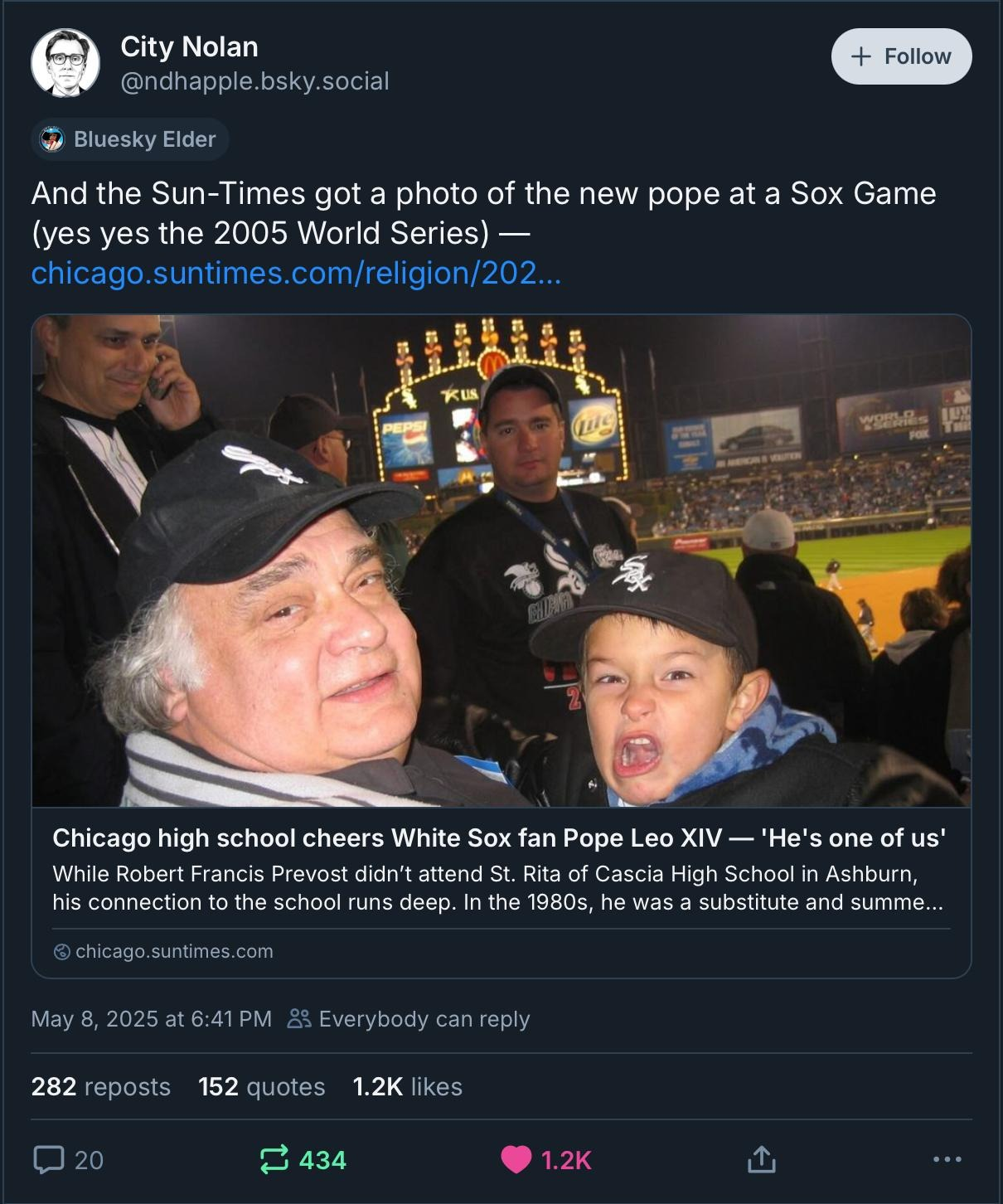 He is the first American and, presumably, the first Chicago White Sox fan to be named pope. A pope with opinions about Juan Uribe. What a time to be alive. The Chicago Sun-Times even has a picture of him attending the 2005 World Series (he's the guy on the phone in the upper left):