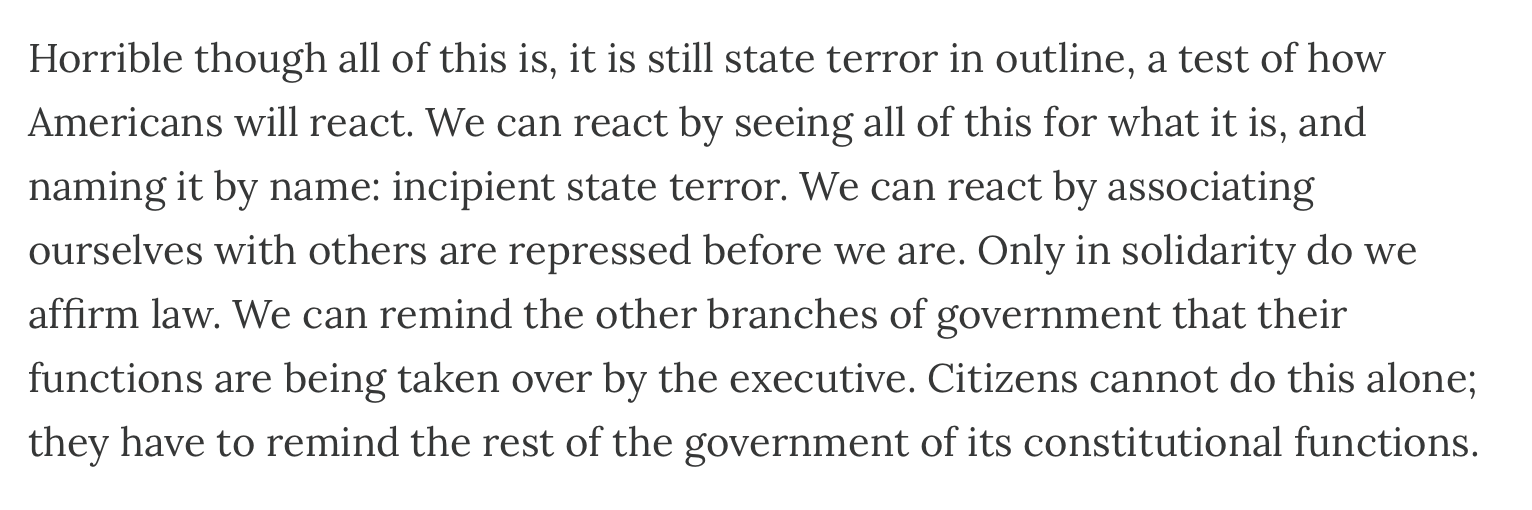 Leading scholar of authoritarianism Tim Snyder has an essay up discussing these events in historical context that is very much worth reading. Please take a look if you can--I don't think it's paywalled, but I might be wrong--but here's a portion of his concluding thoughts: